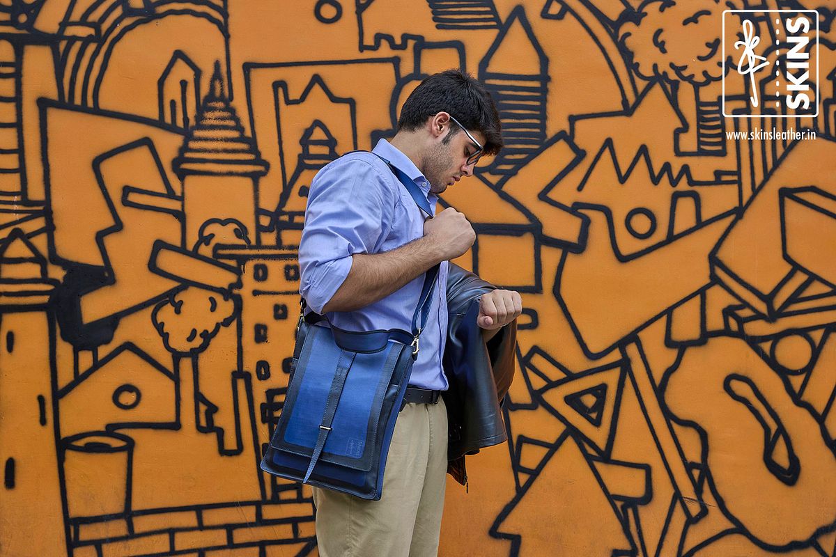 Crafted from A-grade full-grain Italian leather, the Kosha Origin Leather Laptop Bag by Skins by Udit Kulshrestha is the perfect blend of elegance and everyday utility. Made to securely house a 13” laptop — especially suited for MacBook Air or MacBook Pro — this sleek two-tone navy blue and black leather bag is your go-to choice for work, travel, or meetings. Handcrafted in India from A-grade full-grain Italian leather, it features a padded shoulder strap, hidden zippered pocket, detachable hand carry option, and waterproof inner lining—perfect for professionals, creatives, and anyone who values premium craftsmanship and functionality.