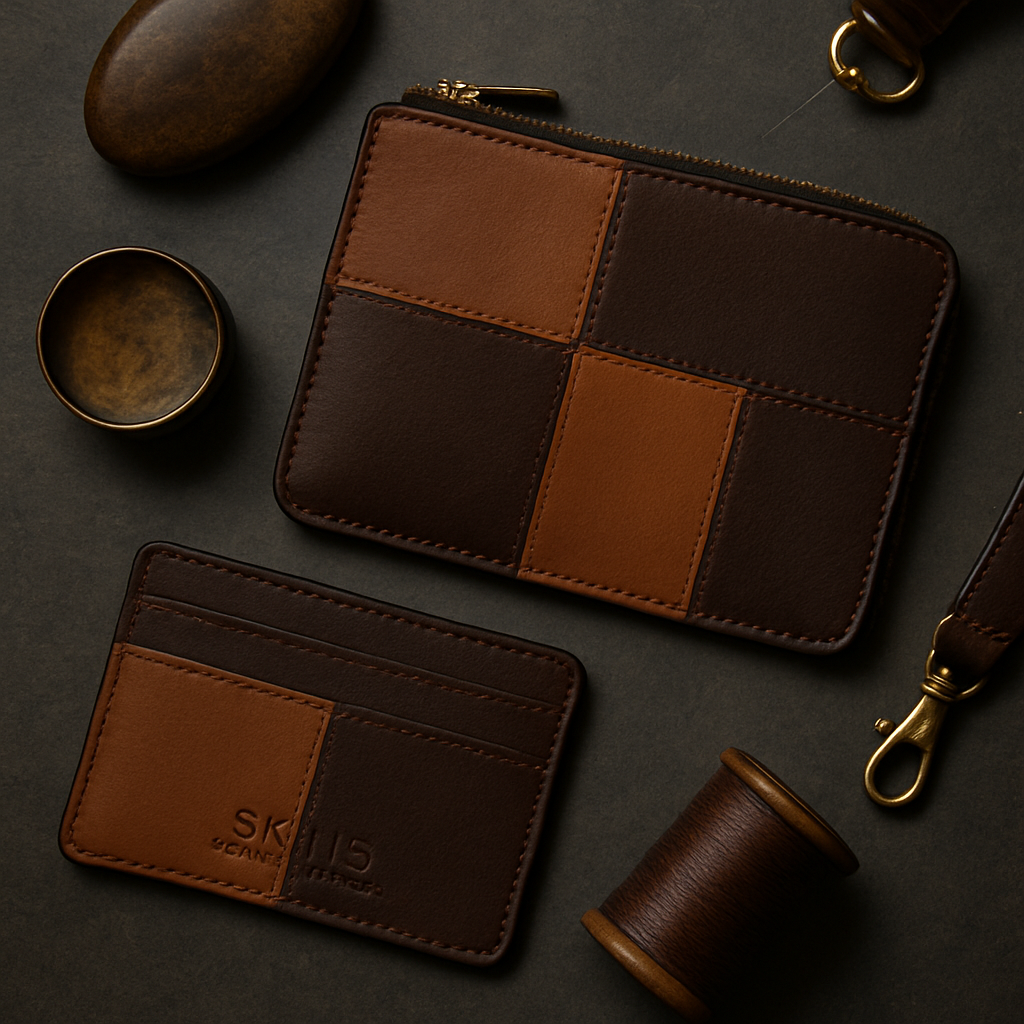 Larger leftover pieces are refashioned into designer leather goods like cardholders, pouches, and small luxury items—functional, refined, and timeless. - Patchwork with Prestige